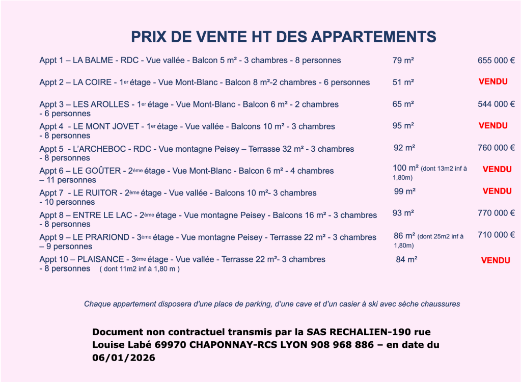 Prix de vente AccueilNotre résidenceNos Appartements1. La Balme (6-8 pers)2. La Coire (4-6 pers)3. Les Arolles (4-6 pers)4. Mt Jovet (6-8 pers)5. L’Archeboc (6-8 pers)6. Le Gouter (8-10 pers)7. Le Ruitor (8-10 pers)8. Entre le Lac (6-8 pers)9. Le Prariond (7-9 pers)10. Plaisance (6-8 pers)LocationsVentesConditions FinancièresPrix de venteAccès Nos PartenairesNotre StationContactRéservation